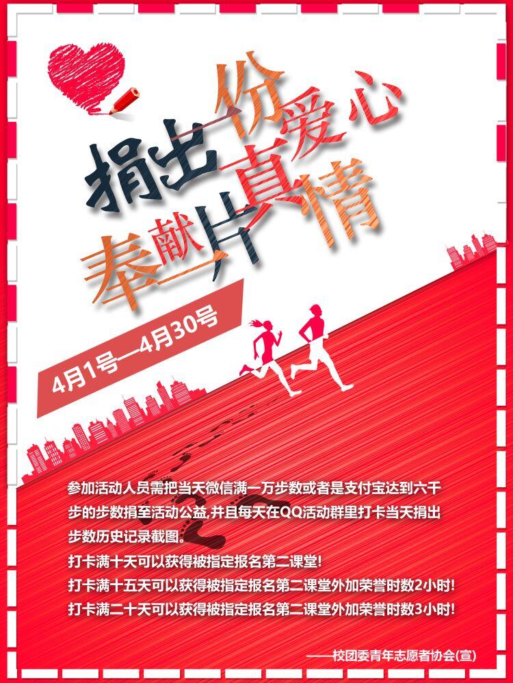 此次活动围绕着“爱心”展开,参加此活动的同学把当天微信满一万步数或者是支付宝达到六千步的步数捐至活动公益,不仅提高了同学们的身体素养,也为为公益献一份独特的爱心。此次活动增强了同学们的时间观念,培养同学们的献爱心意识。