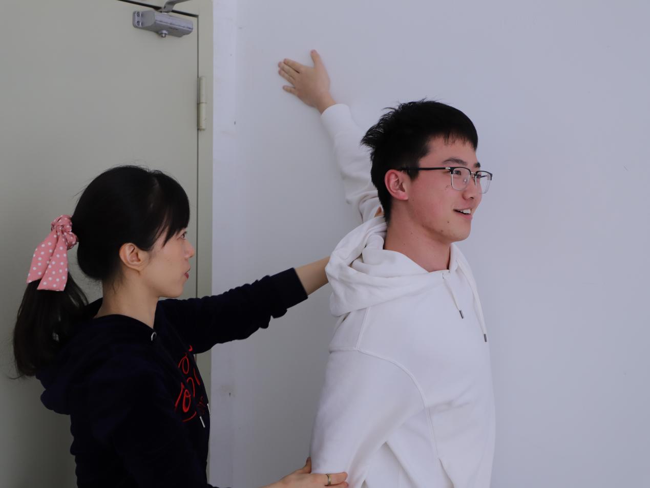第一部分,两位礼仪老师分别就女生和男生的站姿进行一对一的分析与矫正,为后续的训练打下基础;
