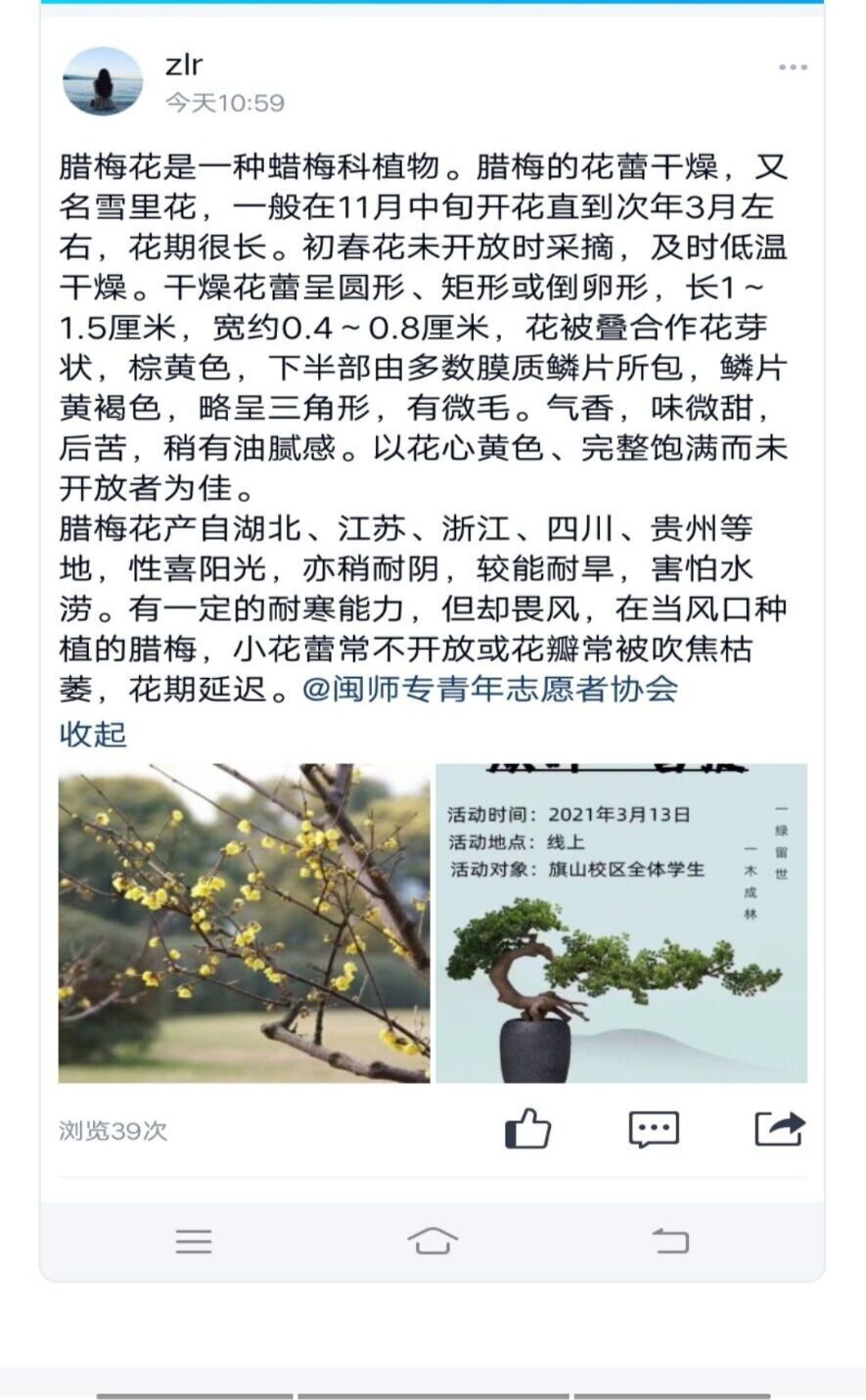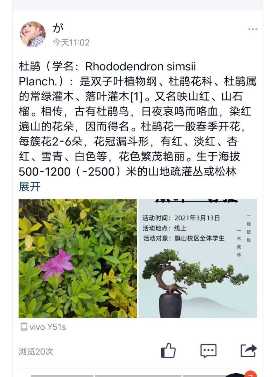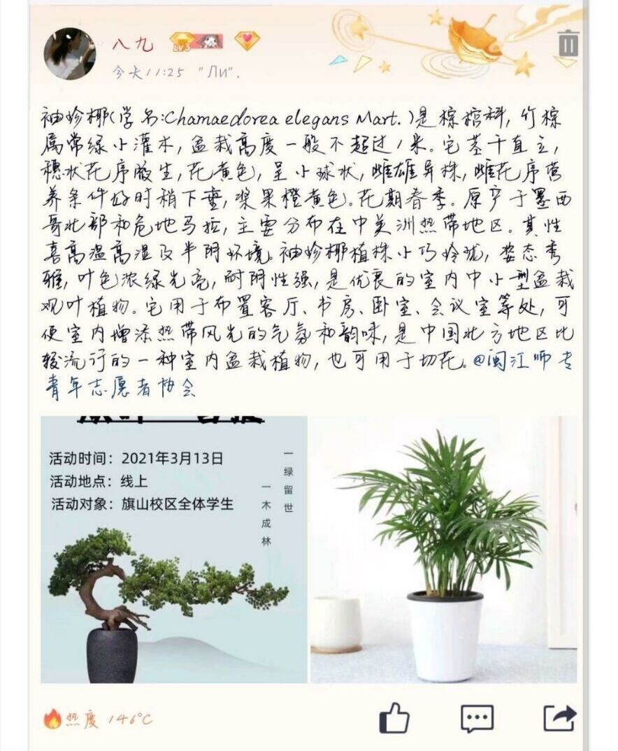为了让我校学子通过对植物的介绍了解到丰富多样的植物,提高学生保护花草的责任感,增强爱护花草的能力。2021年3月13日,我校青协、冰心志愿者服务大队在线上面向全体学生开展了“众翻一世界,众叶一菩提”活动。