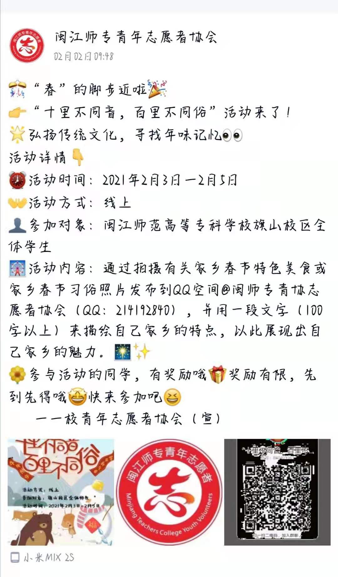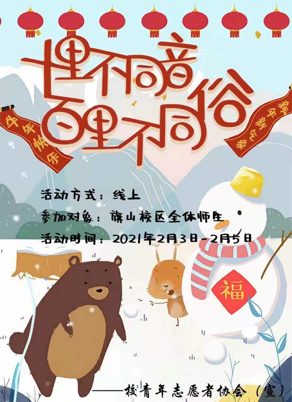 为了让同学们更多地了解到我国各地春节期间的文化习俗,弘扬中华民族传统文化,让来自五湖四海的同学们能够加深认识、增进友谊,丰富校园文化生活,我校团委青年志愿者协会于2021年2月3日至5日面向全体师生线上开展“十里不同音,百里不同俗”主题活动。
