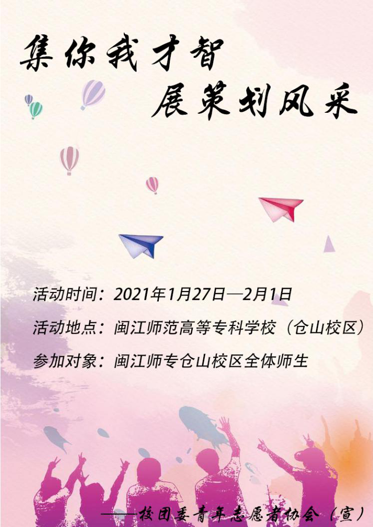 为给我校学子提供一个展现自我能力的活动平台,进一步提升同学们组织策划能力,倡导营造更加良好的校园氛围。我校青年志愿者协会于2021年1月27日至2月1日开展以“集你我才智,展策划风采”为主题的线上比赛。