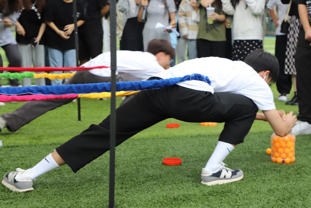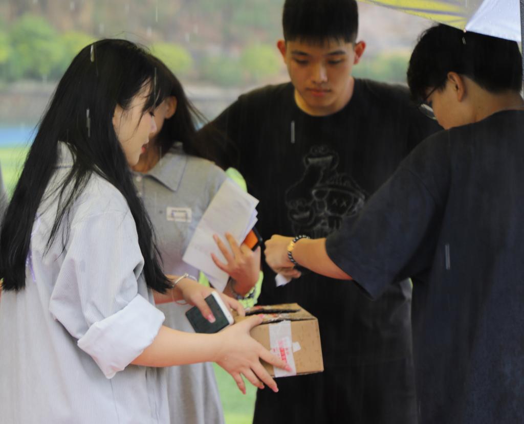 本次活动以团队合作为主要宗旨,以小组为单位,分为“弹力绳游戏”“趣味‘铁人三项’”“盲盒游戏”三个环节,各小组成员需要以细心的观察、持久的耐心、沉稳的思考与果决的行动通力配合达成游戏目标。不但考验了成员们相互配合的默契程度,检验了每位同学的特长和优势,也使大家通过在小组中寻找自我定位、更好地发掘和展示个人能力。小雨浇不灭高涨的热情,友谊在协作中不断升温。