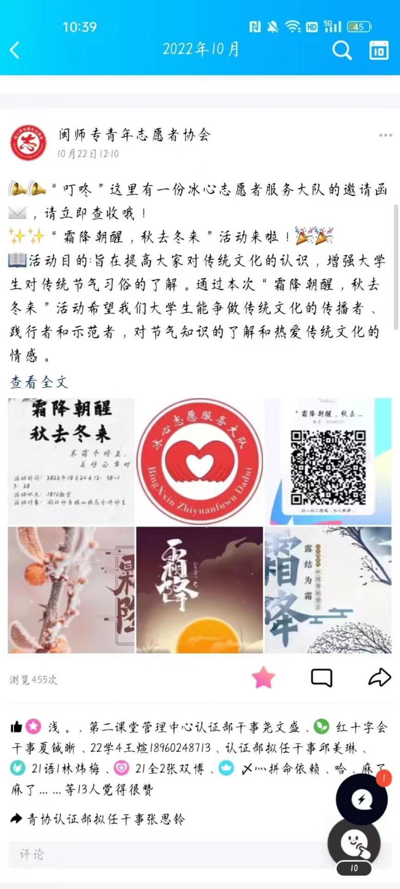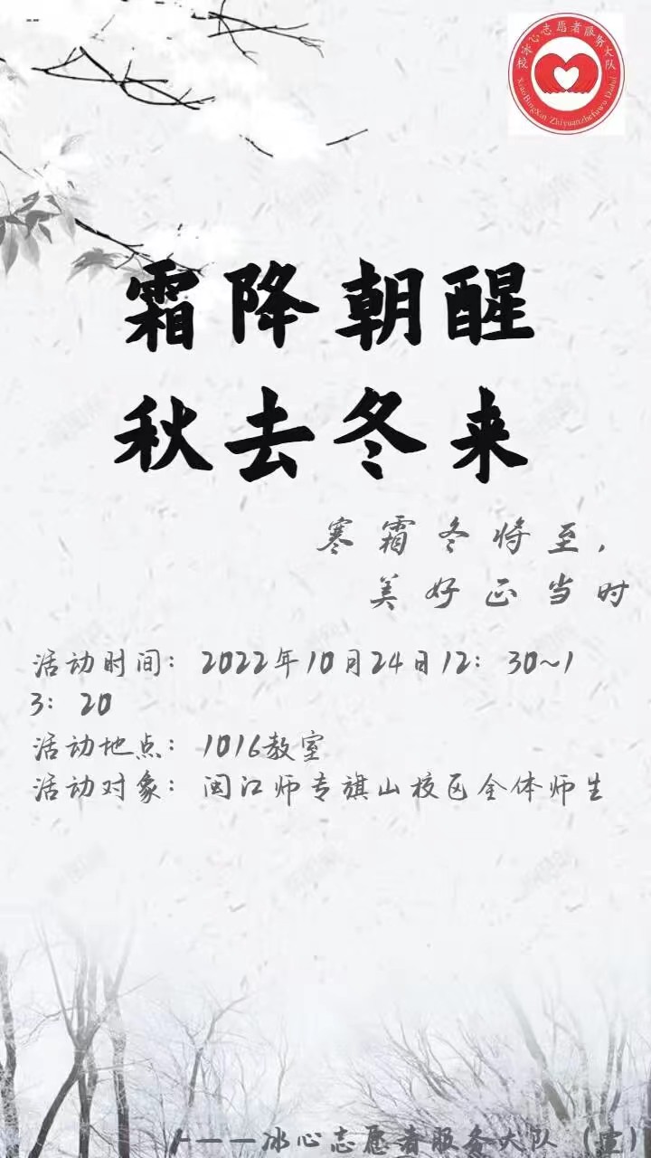 为进一步弘扬和传承中华优秀传统文化,着力营造富有浓厚的传统文化气息的校园环境。2022年10月26日,由我校社团管理中心主办,冰心志愿者服务大队承办的“霜降朝醒,秋去冬来”主题活动于线上通过腾讯会议开展。