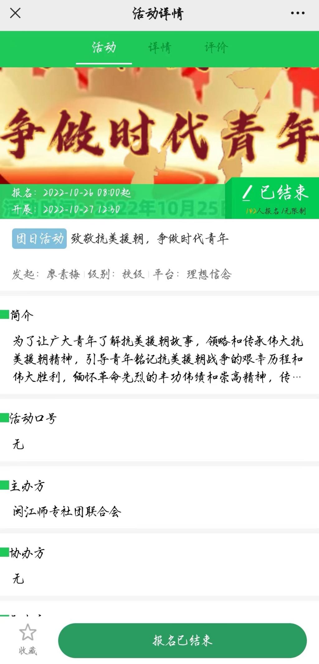 为了让广大青年更多地了解抗美援朝相关故事,领略和传承伟大抗美援朝精神。2022年10月27日,由闽江师范高等专科学校社团管理中心主办,冰心志愿者服务大队承办的“致敬抗美援朝,争做时代青年”主题活动于线上开展。