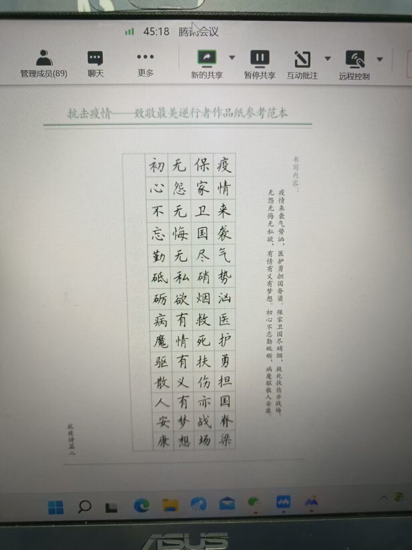 为进一步坚定社会主义理想信念,提高抗疫积极性,增强对抗疫知识的了解。2022年11月2日中午,由闽江师范高等专科学校社团管理中心主办、冰心志愿者服务大队协办的“翰墨寄情,同心抗疫”活动在线上开展,本次活动面向全体师生。