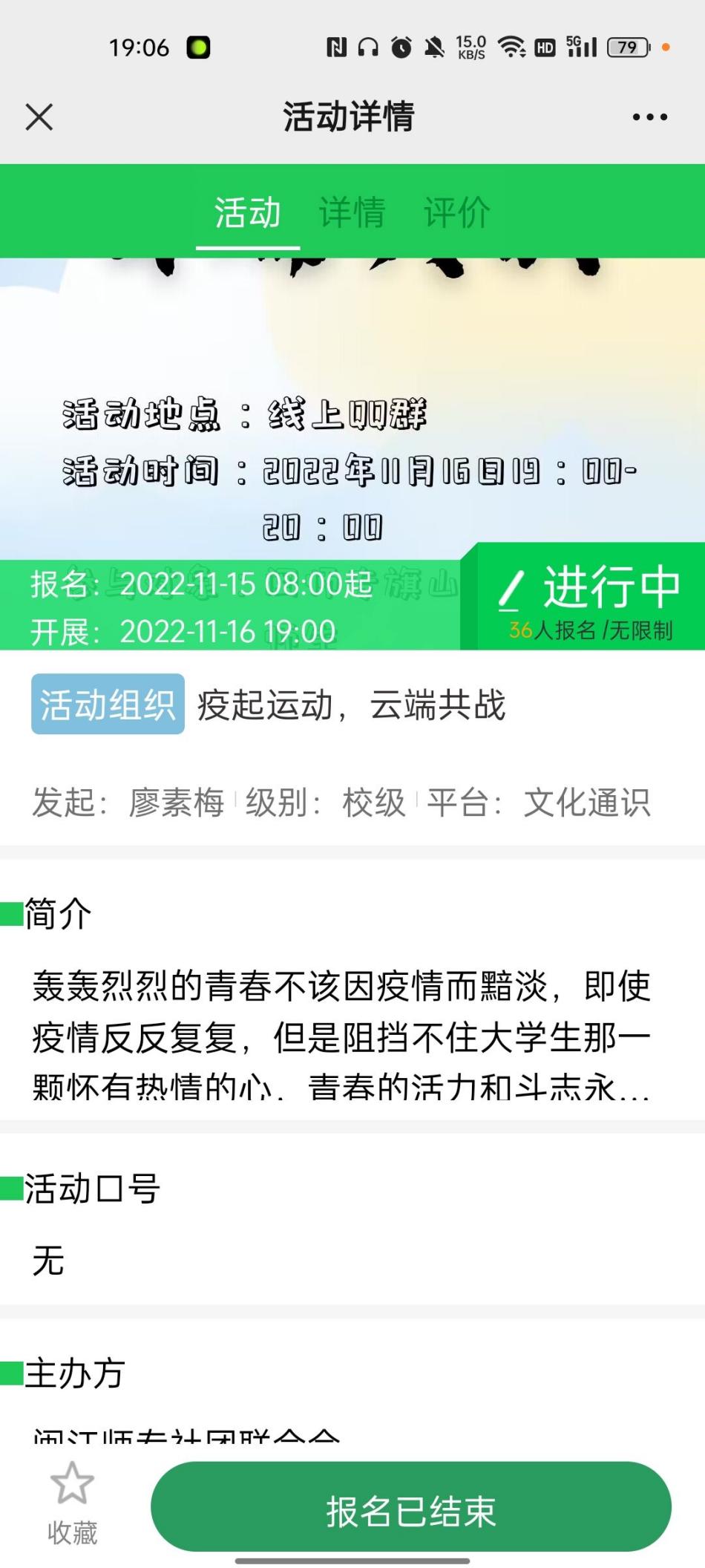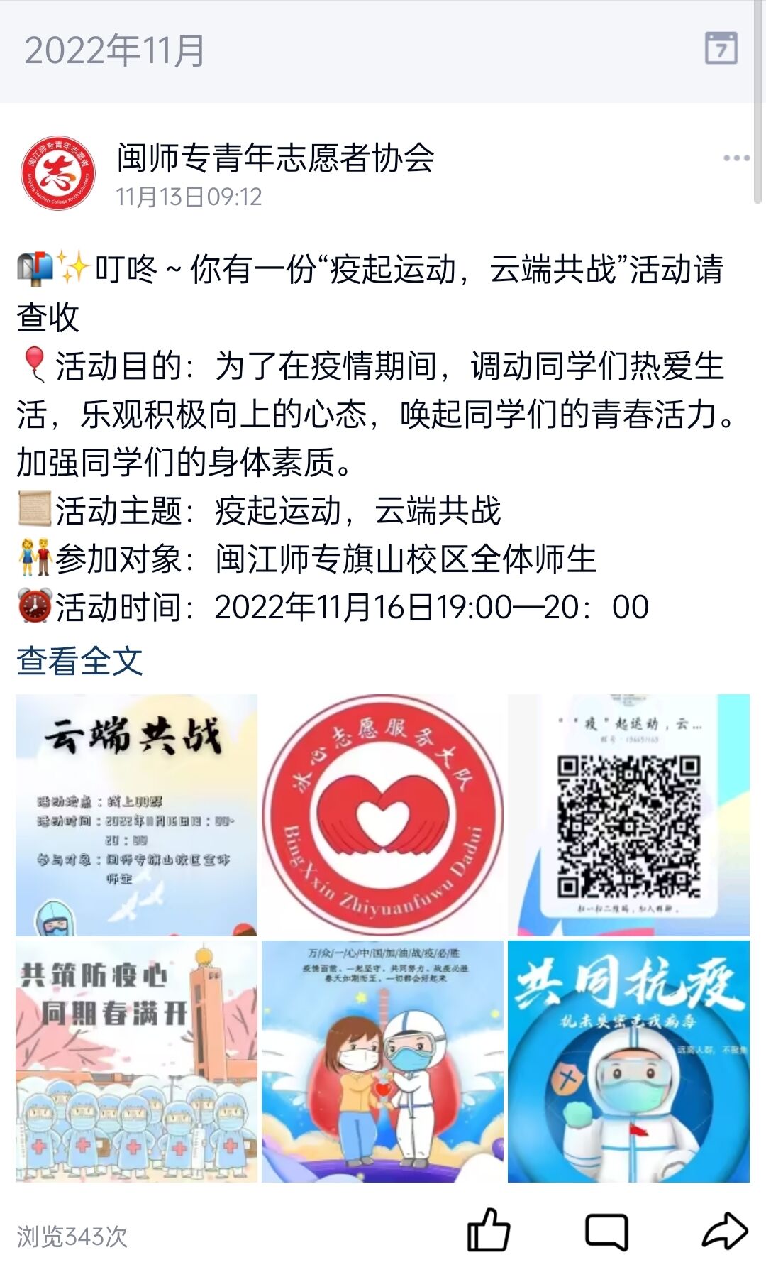 为丰富疫情期间校园生活,提高大学生身心健康素质,保持阳光心态,积极面对疫情。2022年11月16日,由闽江师范高等专科学校社团管理中心主办,冰心志愿者服务大队承办的“疫起运动,云端共战”活动在线上举行。