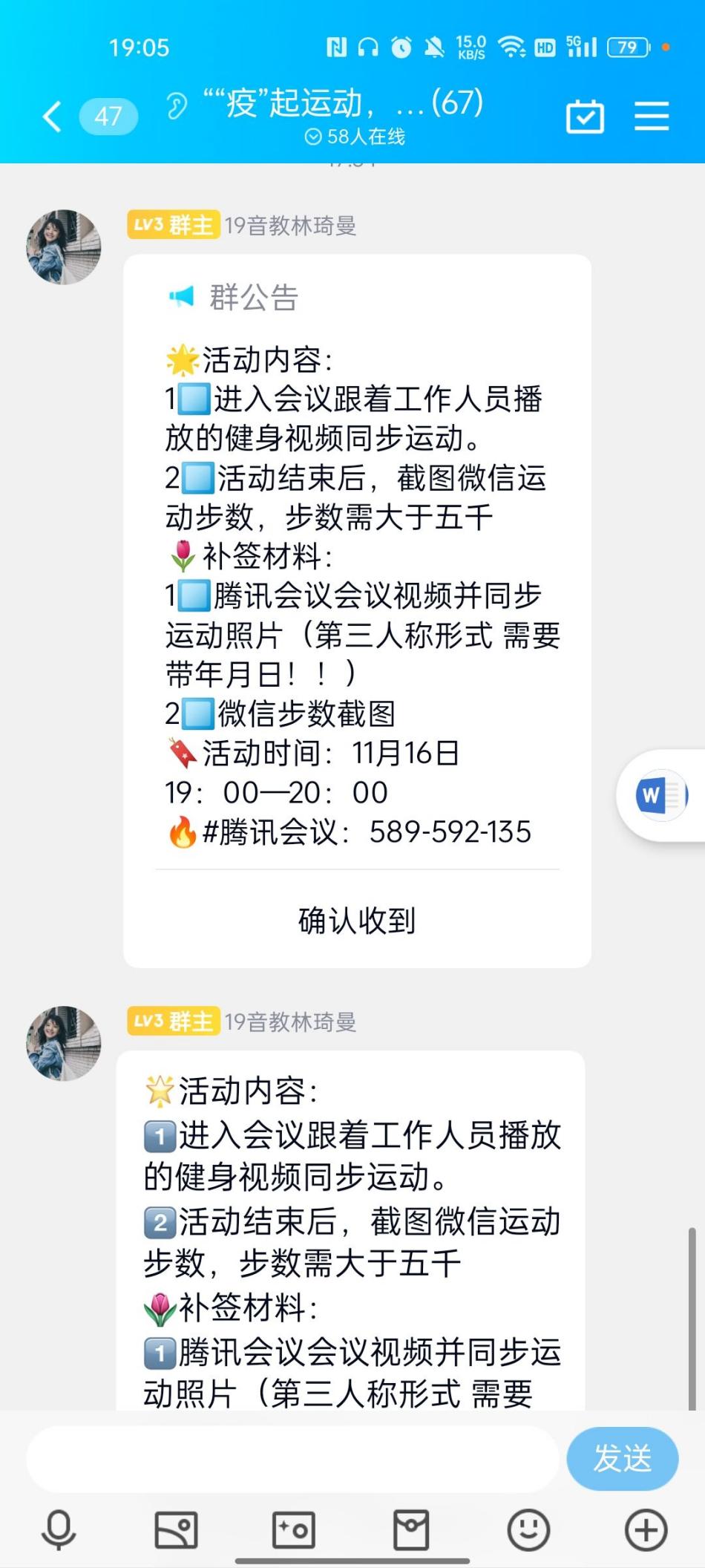 首先,由活动负责人将链接发至线上群中。然后,活动工作人员鼓励同学们跟着播放的健身视频一起开展相关的运动,同学们通过观看运动博主细心地教学并尝试跟随音乐的节奏一起摆动,让大家在线上也能感受到酣畅淋漓的运动。视频结束后,参加活动的同学们在活动群中纷纷晒出自己运动的照片,通过运动使得大家真切地体会到健身的好处,同时也表达出当代青年对生活积极向上的态度,展现了新时代大学生青年的风采。