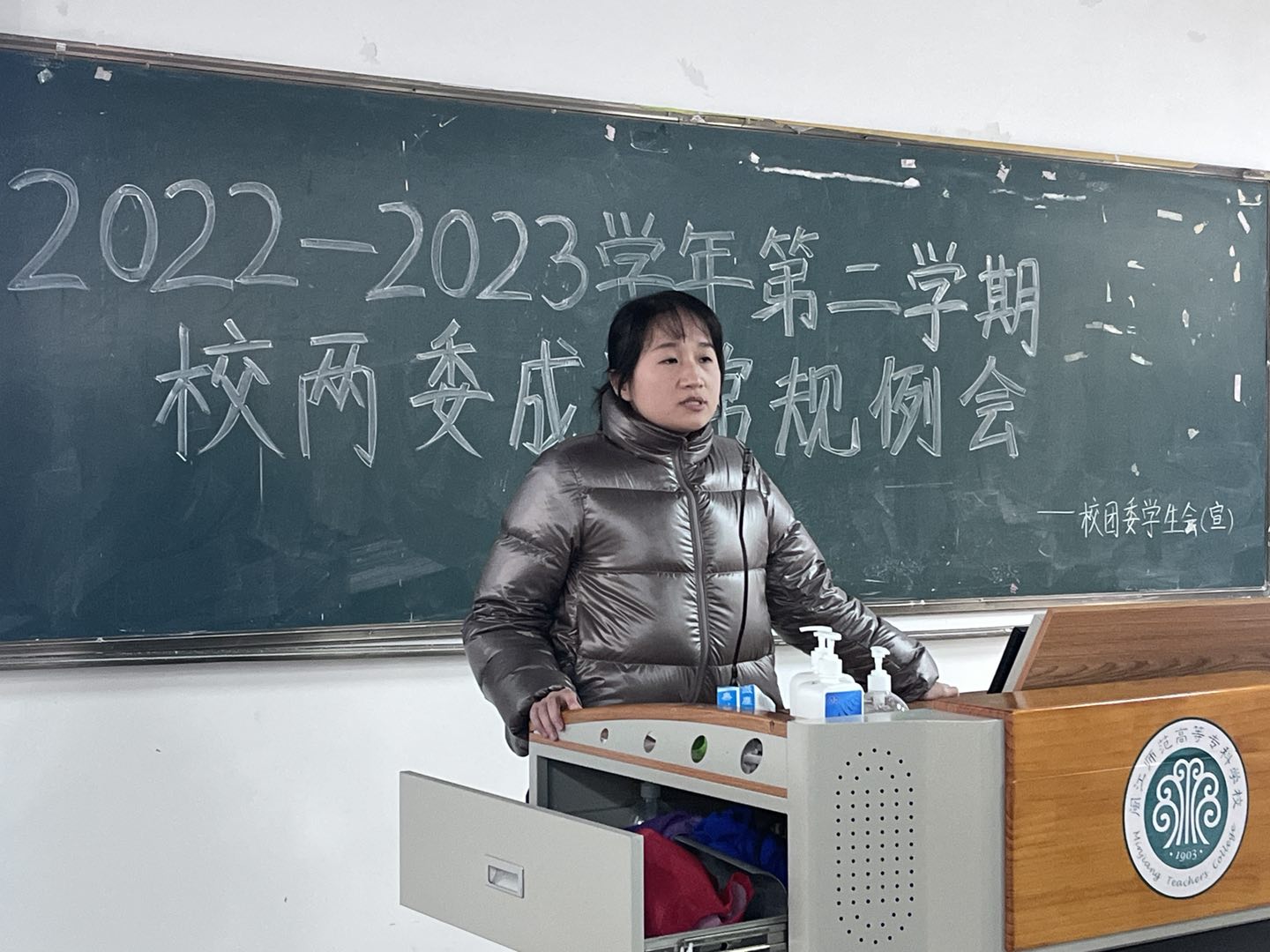 接着,傅智群老师提出指导性意见,指出要尽快调整状态、提高能力、严于律己、树立学生榜样。她强调,校两委是一个温暖、团结的大家庭,不论工作亦或者生活,都应当积极向上,共同努力,相互理解信任。