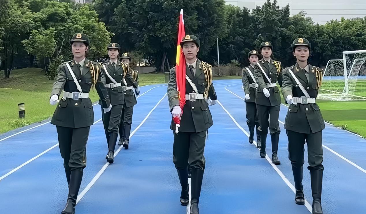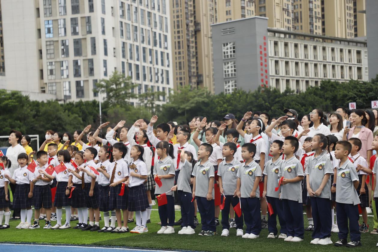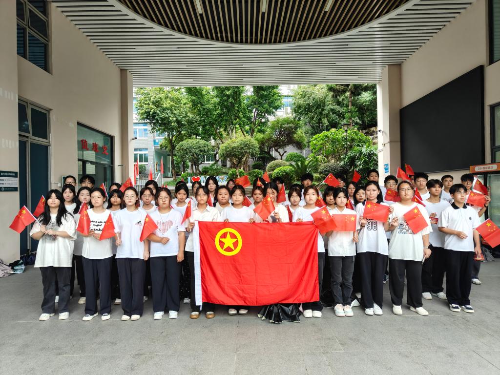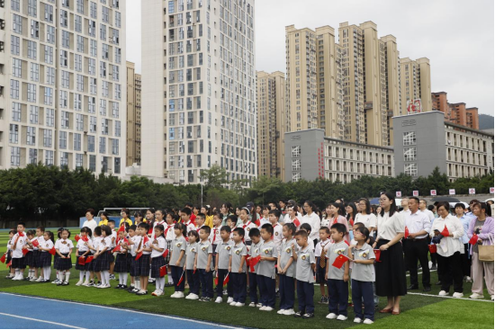 伴着清晨的朝阳,升国旗仪式正式开始。学校国旗护卫队迈着铿锵有力的整齐步伐,口号嘹亮,护送鲜艳的五星红旗进场。随着激昂的国歌响起,全场师生以庄严的姿态肃立,齐声高唱国歌,目光紧随五星红旗缓缓升起,共同见证这一庄严而神圣的时刻。