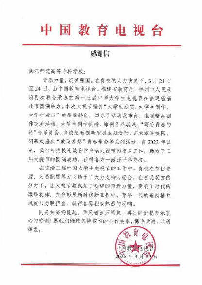 中国大学生电视节连续三届在福州市举办,3月下旬,第十三届中国大学生电视节圆满落幕。中国教育电视台向我校发来感谢信,对我校连续三届大力支持中国大学生电视节表示衷心的感谢。福州市人民政府也发来表扬通报,肯定了我校在第十三届中国大学生电视节上的表现。