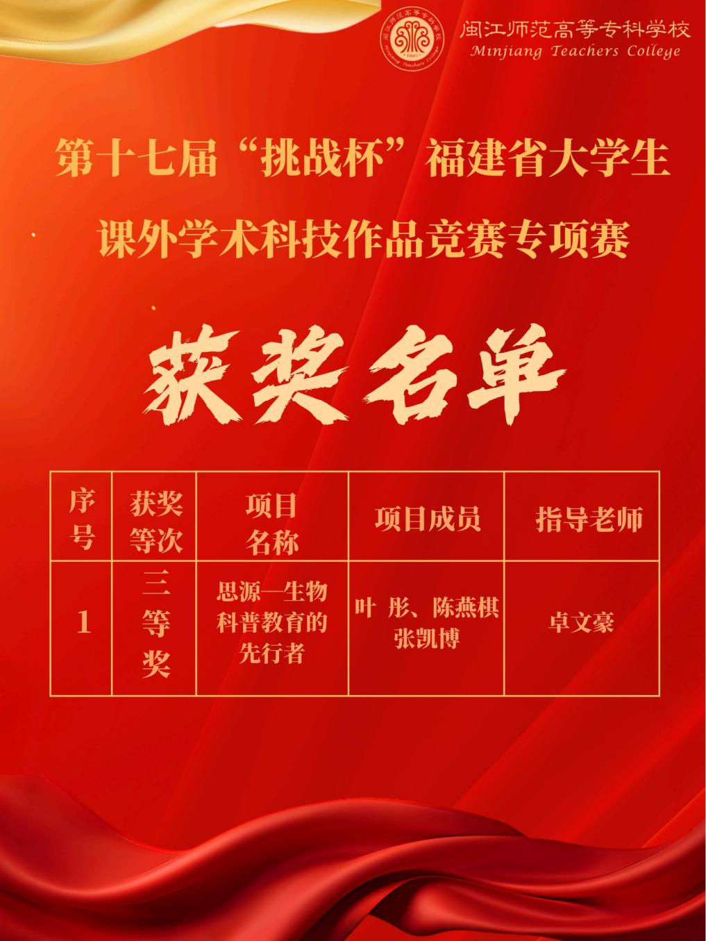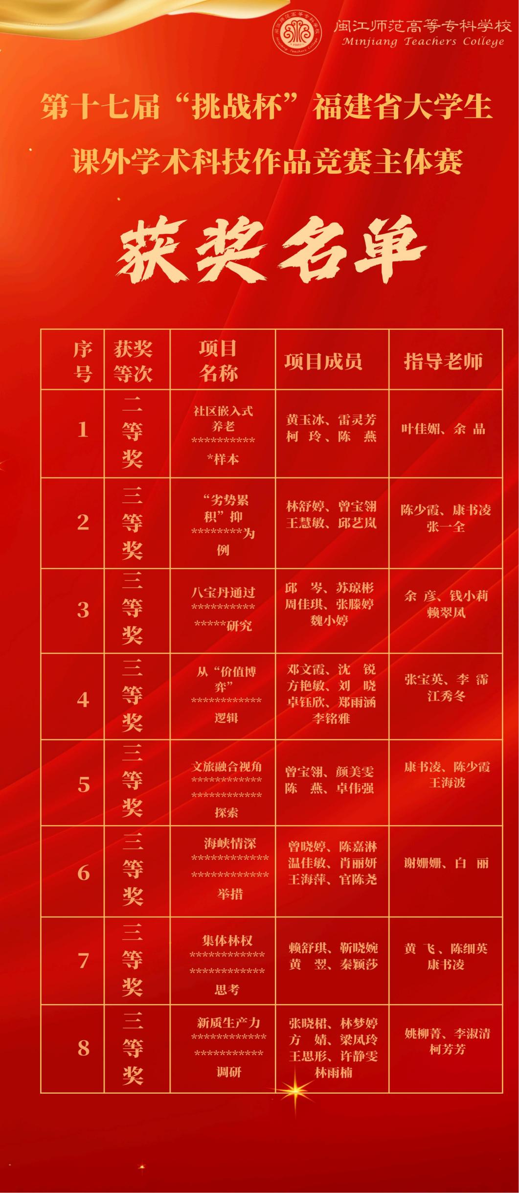 近日,第十七届“挑战杯”福建省大学生课外学术科技作品竞赛终审决赛在福州大学落下帷幕。我校学子在本届大赛中再创佳绩,共斩获9个奖项,包括主体赛二等奖1项、三等奖7项,专项赛三等奖1项。