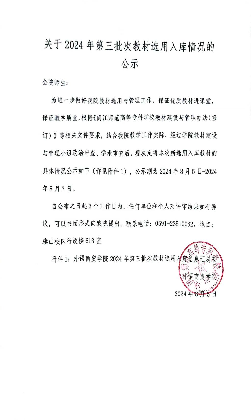 附件1:外语商贸学院2024年第三批次教材选用入库信息汇总表