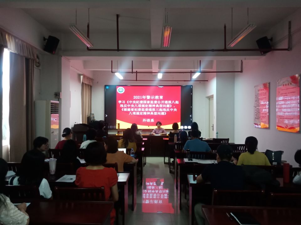 2021年5月20日,外语系何少娴主任在行政楼8楼党员活动会议室召开2021年外语系警示教育会议,外语系全体教师参会。