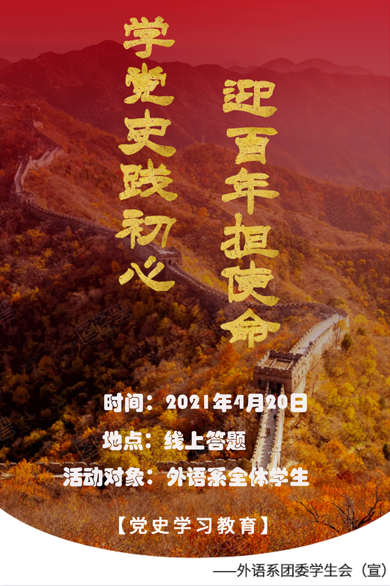 在迎接建党一百周年的重要时刻,外语系于2021年4月20日开展了“学党史践初心,迎百年担使命”线上知识竞赛,全系学生踊跃参加。