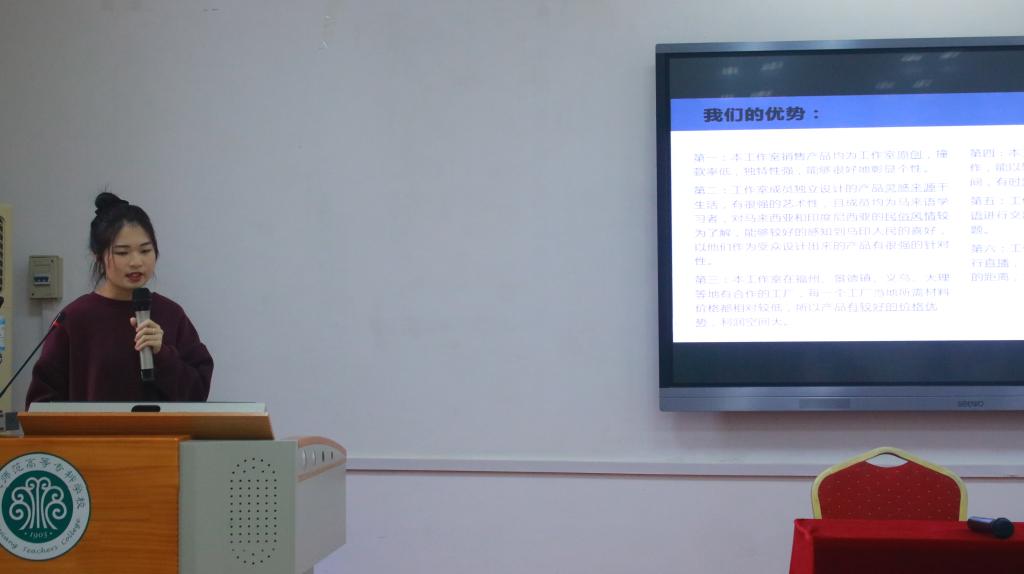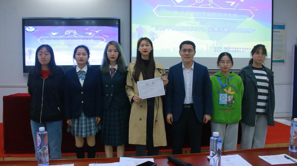 为推动大学生创新创业的发展,进一步提高我系学生的创新创业能力,外语系于2021年4月14日下午在教学楼2016教室举办以“百舸千帆敢闯新时代,起舞弄潮绘创世界梦”为主题的创新创业大赛,出席此次活动的有福建师范大学协和学院教授陈国言老师、外语系副主任陈颖老师、外语系詹秀萍老师、郭瑜婷老师。