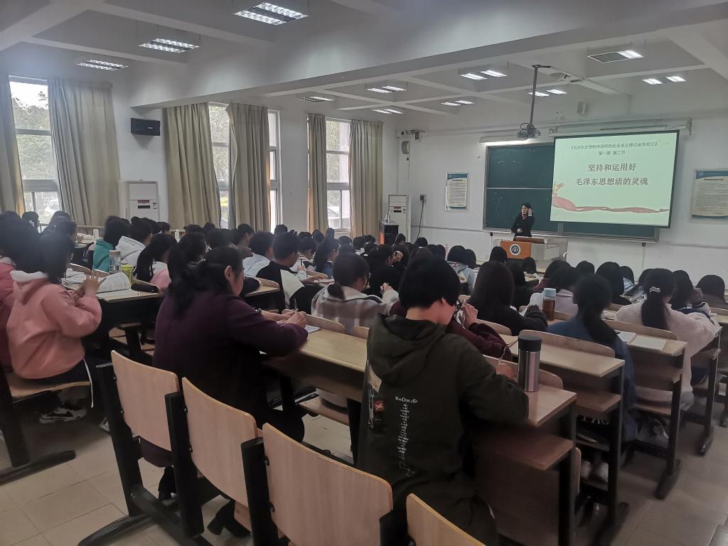 在课上,林旻副校长等老师认真聆听林萍老师的讲授,并对课堂情况进行记录。林萍老师向同学们讲授了毛泽东思想的主要内容,介绍了群众路线、独立自主方针以及大学生该如何践行实事求是思想等。同时林萍老师结合时事,运用案例和视频与大家进行互动,同学们积极回答,课堂氛围活跃。