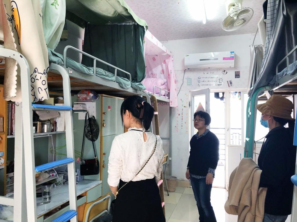 系部主任进宿舍后,亲切地与学生聊天,询问相关的情况,并提醒一些学生注意宿舍开窗通风以及各自桌面的物品整理。对于被发现高功率电器使用的同学,也耐心地进行劝导。虽然此次的宿舍检查学生毫不知情,但是面对突击检查的老师们,学生开门后都能够积极配合检查工作。