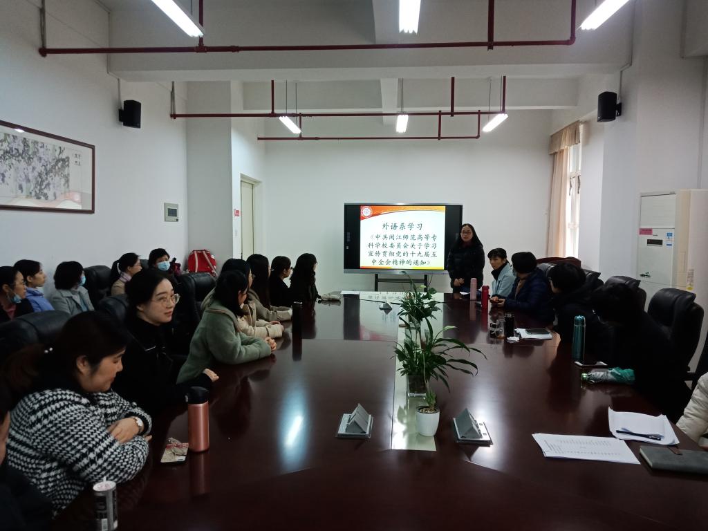 在会议的第二环节,卢燕红副主任带领大家学习了《中共闽江师范高等专科学校委员会关于学习宣传贯彻党的十九届五中全会精神的通知》,卢燕红副主任强调,各位老师要认真学习并贯彻党的十九届五中全会精神;要深刻领会核心要义,把思想和行动统一到全会精神上来,凝聚同心共筑中国梦的强大力量。