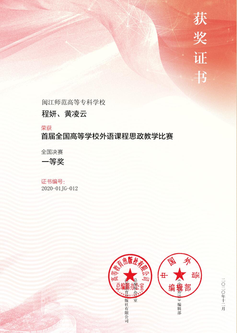 在12月22日公布的“首届全国高等学校外语课程思政教学比赛”全国决赛的结果中,由外语系程妍老师和黄凌云老师组成的教学团队荣获高职高专组一等奖的佳绩。