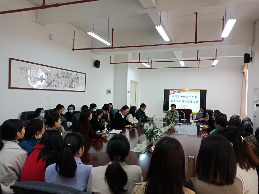 在会议的第一个环节,何少娴带领外语系全体教职工学习贯彻党的十九届五中全会精神专题宣讲。何主任强调,党的十九届五中全会是在我国将进入新发展阶段、实现中华民族伟大复兴正处在关键时期召开的一次具有全局性、历史性意义的重要会议。会议强调外语系全体教职工都应进一步深化习近平新时代中国特色社会主义思想的理论阐释和实证研究,为实现中华民族伟大复兴贡献“闽江师专外语系智慧”。