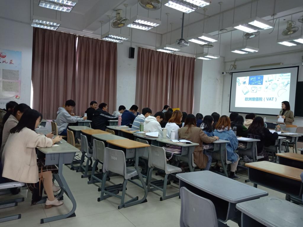 在听课环节,各位教研室老师深入课堂,观察着学生的反应与师生之间的互动等情况。在课堂上,郭瑜婷老师运用信息化教学手段,并结合案例引入,帮助学生理解“欧洲增值税”单元的重点与难点,运用故事化、情景化案例帮助学生理解增值税在欧洲的运作流程,同学们配合度高、课堂秩序井然。