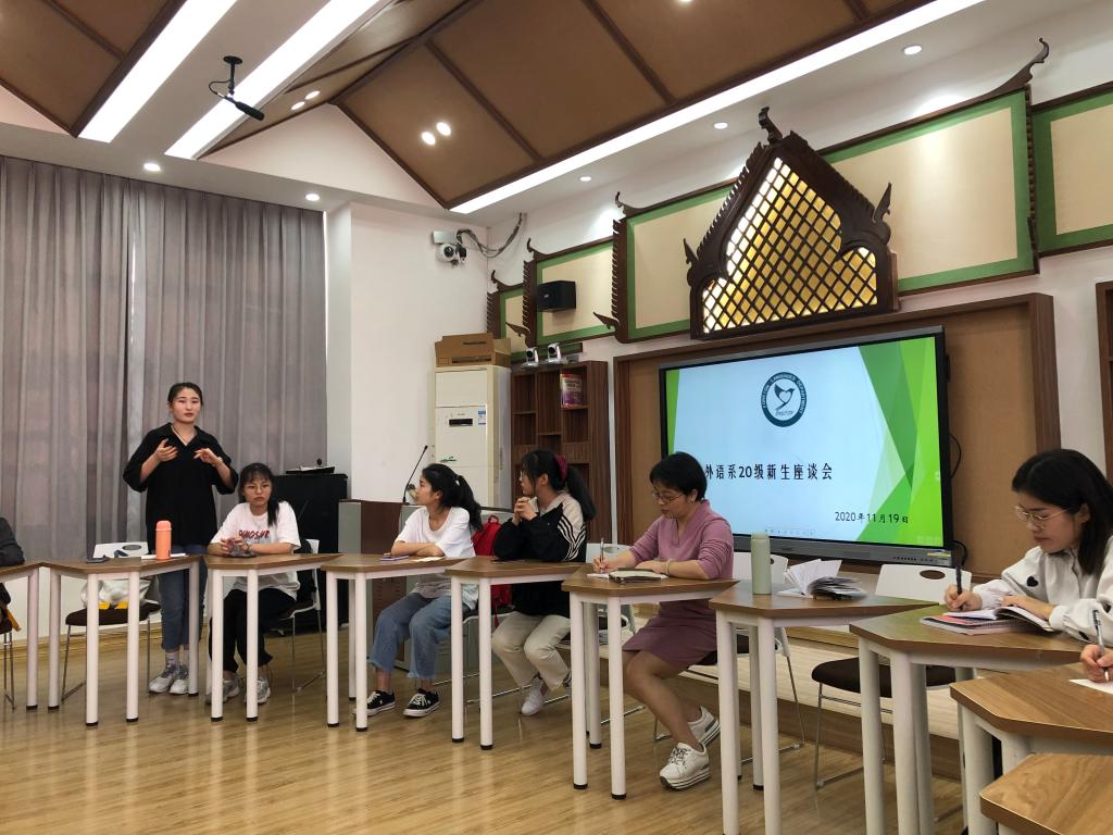 为更好的了解2020级新生在大学的学习和生活适应情况,更好的倾听新生心声,11月19日下午,外语系在教学楼5013召开2020级新生座谈会。本次座谈会由新生辅导员许璐颖老师主持,系副主任陈颖老师出席,2020级各班学生代表参加了座谈会。