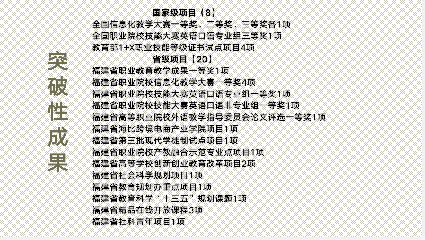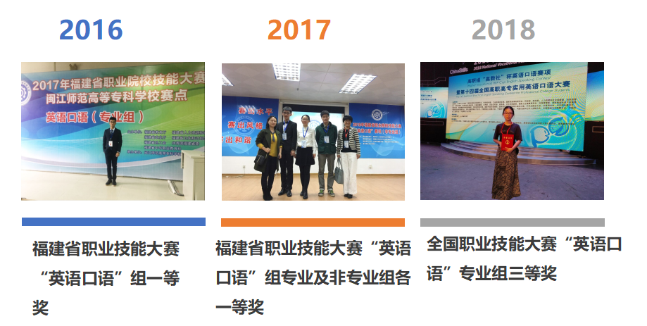 学生团队近三年在英语口语赛中获得国家级三等奖;在全国高职高专英语写作比赛、互联网+国际贸易综合技能等各类赛事中连续9年获得福建省赛区一、二、三等奖的优异成绩。在2020年获得福建省大学生创新创业大赛铜奖。