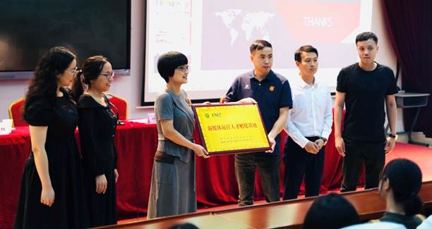 校企合作授牌仪式暨“新媒体运营工作室”启动仪式于2021年6月2日在教学楼2018教室举行。海纳蓝天教育科技有限公司董事长许良远、新媒体运营中心总经理林俊勤、外语系主任及跨境电商专业群全体教师以及19级学生代表共同参与本次仪式。