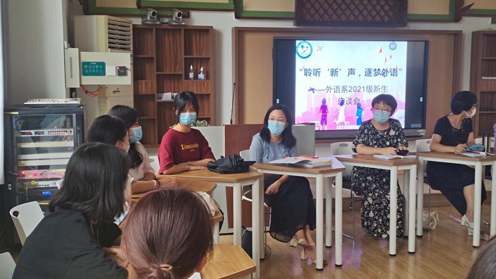 2021年9月22日下午,闽江师范高等专科学校外语系组织召开了以“聆听‘新’声,逐梦外语”为主题的新生座谈会,旨在听取同学们对于教学、管理、服务等方面的意见和建议,传达系部对新生的关心关怀。外语系主任何少娴、系党总支副书记陈颖、系副主任卢燕红、商贸教研室主任陈海燕、英教教研室主任尤佳、应外教研室主任林超、公共外语教研室主任黄凌云、新生辅导员以及24名外语系新生代表参加了此次会议。