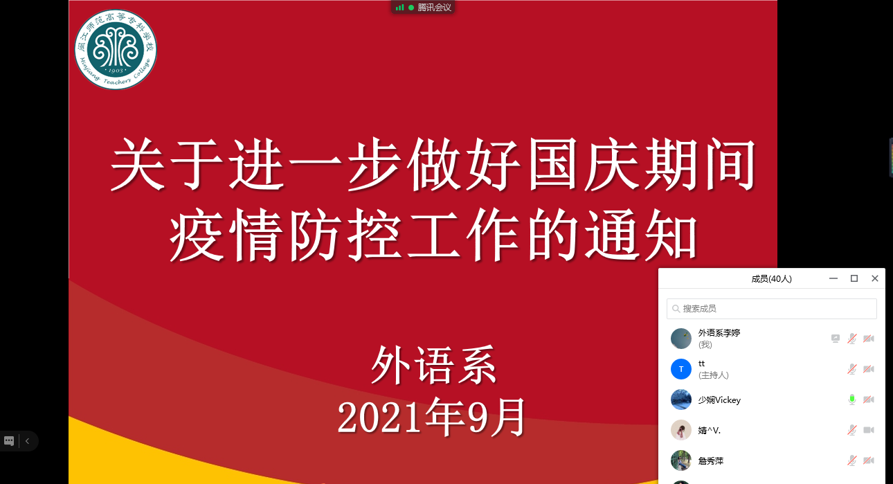 会上,何少娴主任强调要进一步做好国庆期间疫情防控工作,带领大家学习了《关于国庆期间学校安全工作提示》、《关于进一步做好国庆节期间疫情防控工作的通知》、《福建省教育厅应对新冠肺炎疫情防控工作领导小组关于做好国庆假期高校疫情防控有关工作的提示函》(闽教便函〔2021〕1284号)和《致全市市民的一封信》等文件,鼓励老师们就地过节,非必要不出省、不出市、不出县、不出校,做好疫情期间的防控措施。