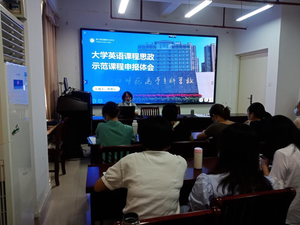 在会议的第二环节,公共外语教研室主任黄凌云老师进行“大学英语课程思政”专题的分享交流,黄凌云老师与大家分享了自己对“大学英语课程思政”建设的想法与体会。黄凌云老师强调思政元素与知识点的融合标准应该是能够引起学生的情感共鸣,能够有效促进学生对课程知识的理解、掌握、拓展与深化。黄凌云老师建议到,“课程思政”的设计需要知识模块重组、文件深度解读、德育内涵发觉,课程的价值维度应该与专业理论和知识融为一体。最后,黄凌云老师强调优质的“课程思政”教学设计应该是创新的,有特色的,需要老师们长期的积累和更多的思考。