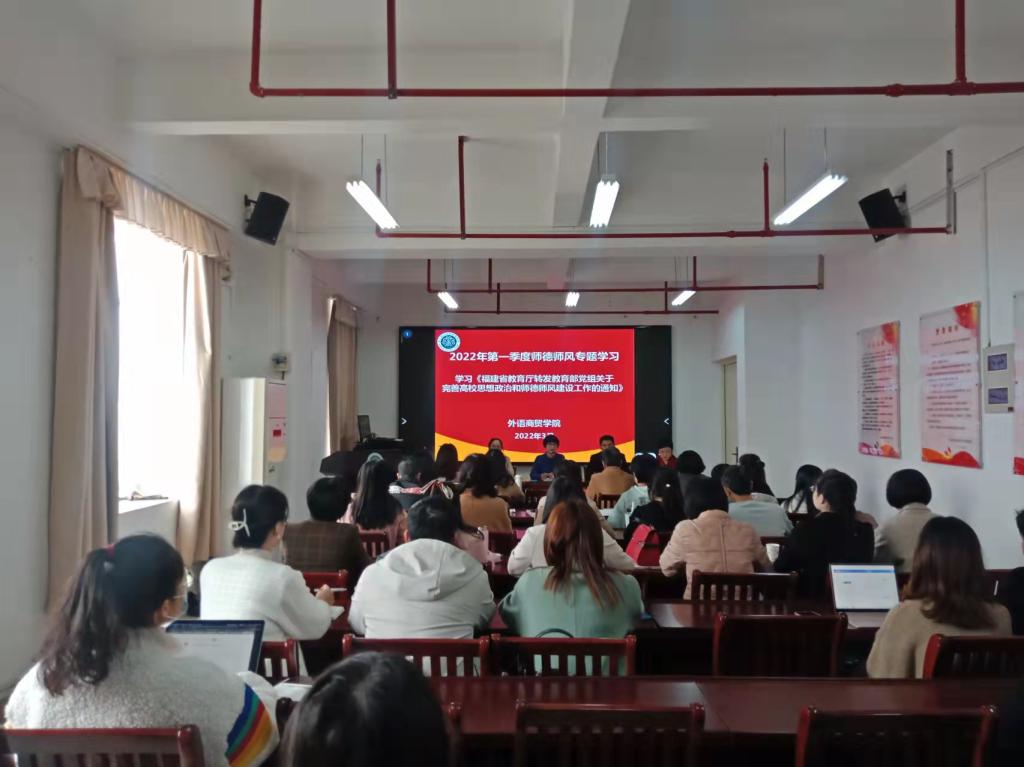会议组织学习了《福建省教育厅转发教育部党组关于完善高校思想政治和师德师风建设工作的通知》,会议强调,全体教师要继续贯彻落实习近平总书记关于教育的重要论述,进一步加强党对高校教师工作的领导,建设政治素质过硬、业务能力精湛、育人水平高超的高素质教师队伍。