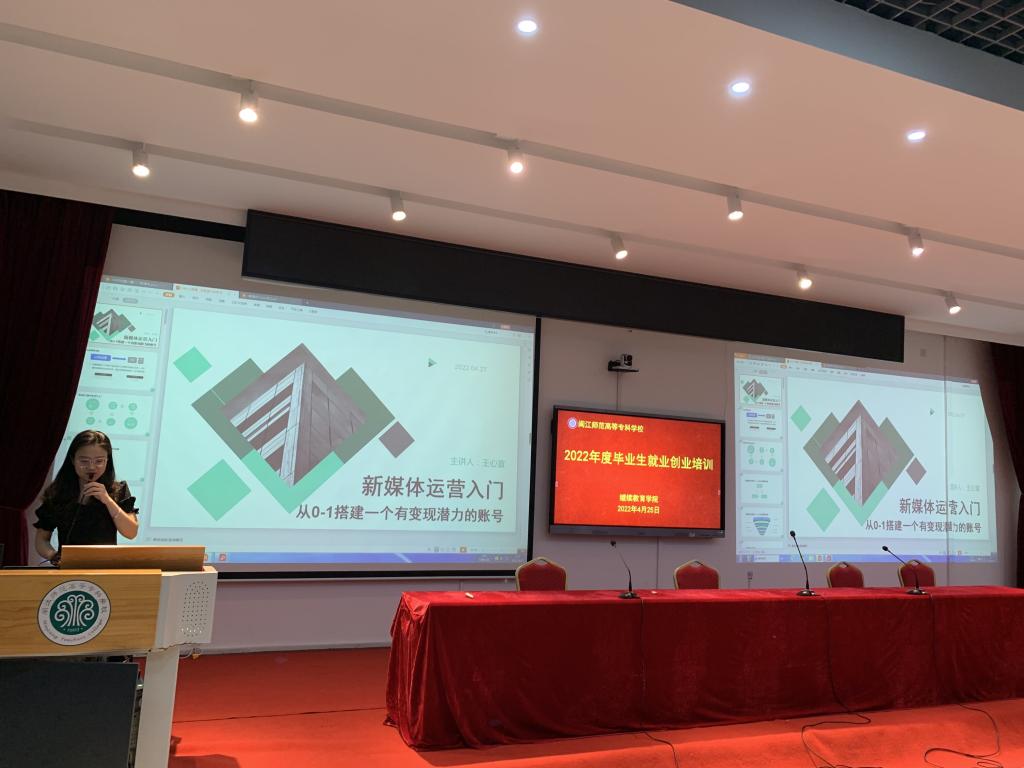 4月27日上午,由继续教育中心主办的2022届毕业生创业就业培训在旗山校区2018教室举行。我院教师王心宜开展了《新媒体运营入门》、《直播账号运营搭建》两个主题的培训讲座。