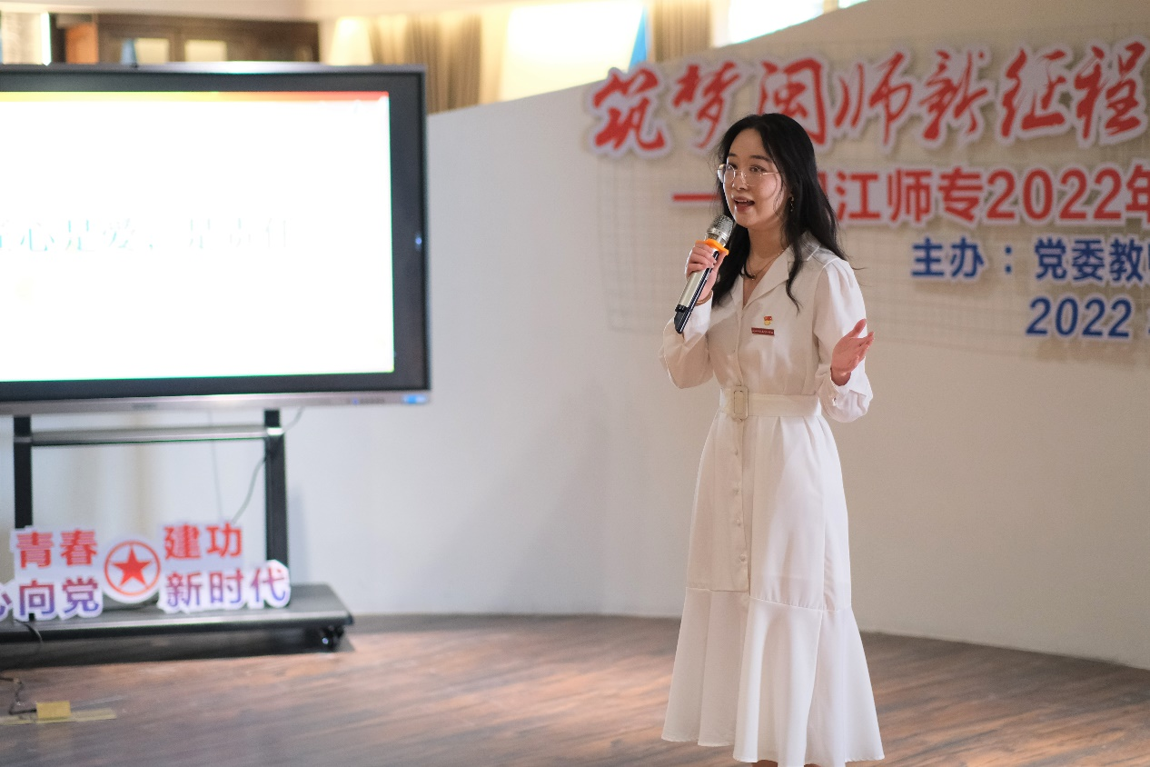 我院青年教师代表应用外语(马来语)专业教师金曦以《致匠心》为题为大家献上朗诵表演,通过朴实而真挚的文字,分享了她作为一名新教师第一次走上讲台,第一次带领学生参加竞赛的心得和培养高素质技能型匠心人才的感悟。她说“匠心是清泉,滋润荒芜的心田,匠心是爱,是责任。”无不流露出一名当代职业院校教师培养大国工匠的初心使命和赤子情怀。我院青年教师代表应用外语(柬埔寨语)专业教师郑美玲分享了她在异国他乡求学时的经历,深切感受流淌在血液里的爱国情怀与民族自豪感,在世界面前表现出当代中国青年自信向上的风采,同时也道出了身为一名教师应肩负起新时代爱国主义教育的责任和担当。