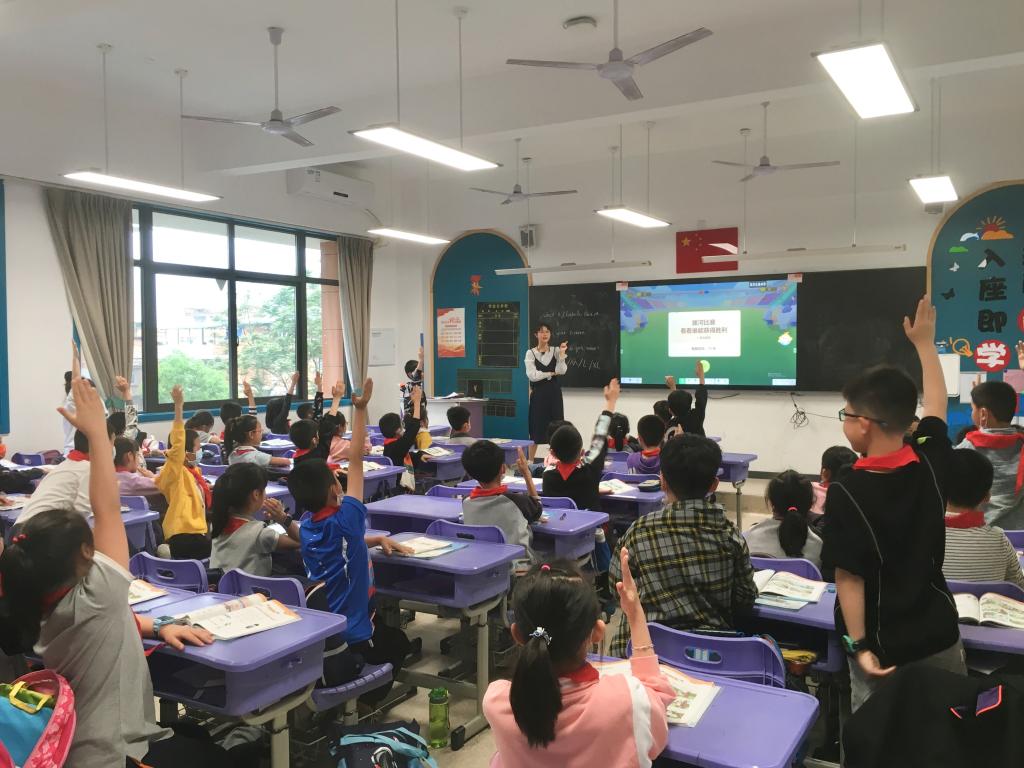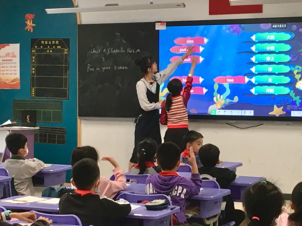 在上课前,老师播放歌曲Who is Wearing a T-shirt Today并与同学们进行了问候互动,同学们对新老师的到来感到十分激动,表示欢迎。在课堂中,学生们积极参与丰富的课堂活动,如单词连接游戏等。老师引导操练了put on, wear等单词以及句型“What size do you wear?”“It’s too big.”“It’s too small”等。不仅如此,师生还进行了多样的课堂互动:如ask and answer 与 do a reach。这些互动使学生充分掌握了本节课所学内容,最后老师也对积极参与课堂活动的同学,进行表扬和奖励。
