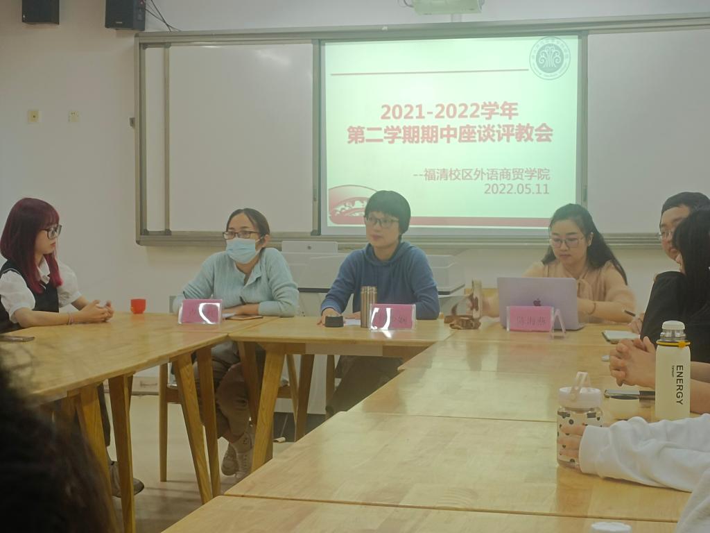 为进一步了解学生对我院教师教学情况的意见及建议,提高教学水平及质量,我院于2022年5月11日在福清校区期中开展座谈评教会。会议由外语商贸学院何少娴院长主持,卢燕红副院长、商贸教研室主任陈海燕老师、辅导员王玉琥老师以及各班级学生代表共同参加。