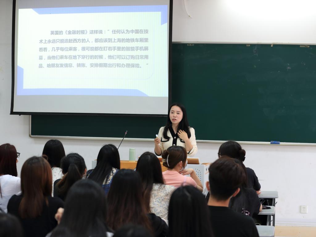 许璐颖、钱小莉老师各自围绕“打造数字经济新优势”这一章节开展深入细致的思政教学实践。许璐颖老师从“数字经济是什么”、“为什么要发展数字经济”、“中国发展数字经济有哪些优势”三个方面来引入课堂教学内容,并结合大量案例,对产业数字化和数字产业化进行了深入分析和生动讲解。钱小莉老师通过介绍“生活中的数字经济”通俗易懂地为同学们解读数字经济的内涵及应用,同时展示国内外数字经济的显著成果,帮助学生全面了解数字经济的重要战略意义及面临的机遇挑战,培养学生运用数字化思维来提高学习、工作效率的能力。