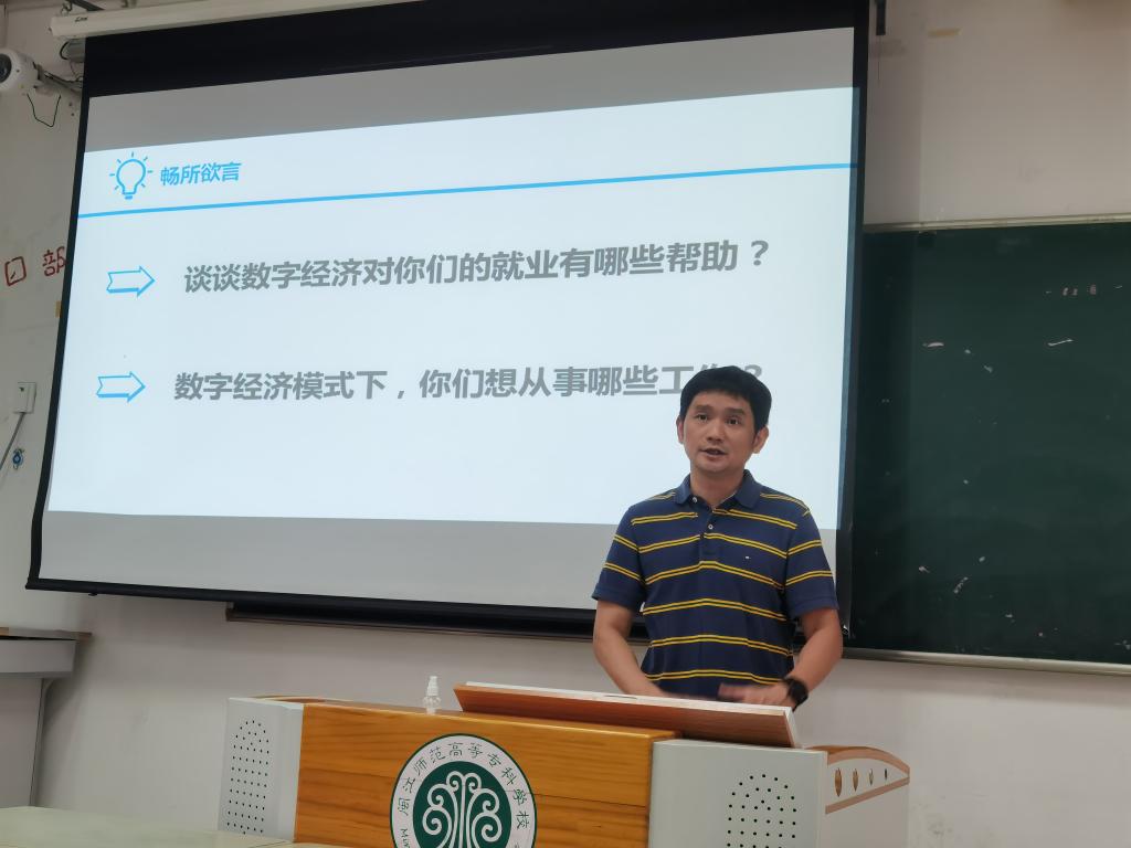 林冉书记在课堂伊始指出,在新冠肺炎疫情的冲击下,数字经济已经成为“稳就业”的重要手段;随后,深入分析数字经济时代就业市场的新特点,并从“扩大就业市场规模、激发企业发展活力、促进就业结构转型、优化就业市场生态”四个层面详细解读数字经济对就业的促进作用;接着,与学生进行互动,让学生结合所学专业谈谈自己的职业规划,课堂气氛活跃。