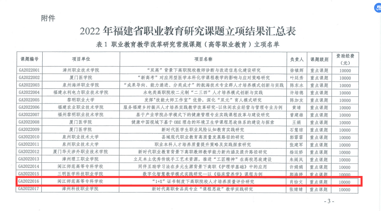 近日,福建省职业教育技术中心公示了2022年度福建省职业教育研究课题评审结果,我院肖怡文老师的《“1+x”证书制度下高职院校人才培养质量评价研究》喜获重点课题立项。