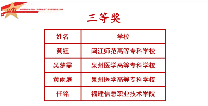 此赛项成绩充分展示了外语商贸学院师生积极向上、奋勇拼搏、团结协作的风采,是外语商贸学院积极推进专业建设的阶段性成果,通过此次比赛,外语商贸学院的英语教学水平得到了充分的检验,对促进专业教学改革,提高办学水平,提升学生综合素质,起到了积极的推动作用。