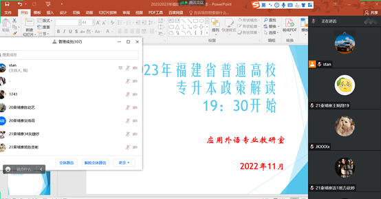 近期,福建省教育厅公布的《福建省普通高校专升本考试说明》对福建省普通高校专升本考试招考类别和考试科目进行了调整,为帮助应用外语专业(柬埔寨语方向、马来语方向)学生更好地了解我省普通高等学校专升本考试招生具体政策,帮助学生在报考过程中答疑解惑,11月17日,应用外语专业教研室主任林超通过腾讯会议召开“专升本”政策解读说明会,应用外语专业全体师生参加了会议。