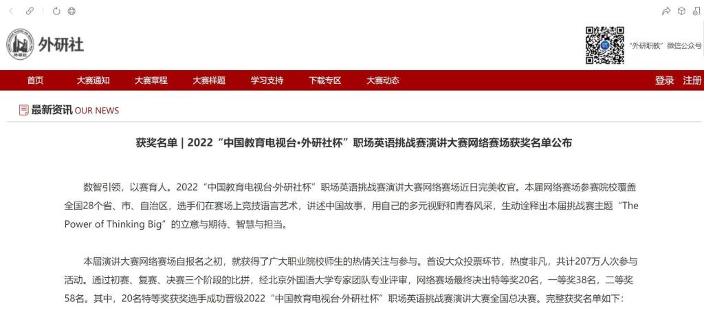 10月29日,2022“中国教育电视台·外研社杯”职场英语挑战赛演讲大赛福建赛区决赛圆满落幕,我院何凌老师指导19应用英语五年专的郑健晔同学获得一等奖,程妍老师指导的21小学英语教育2班康思颖同学获得二等奖。