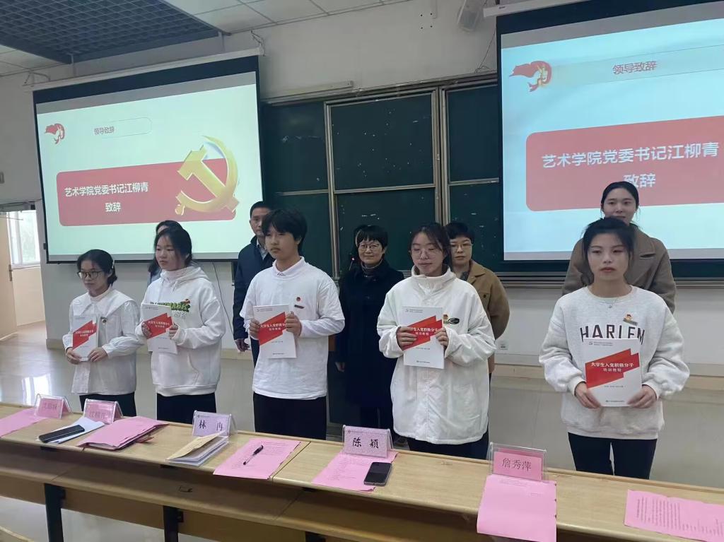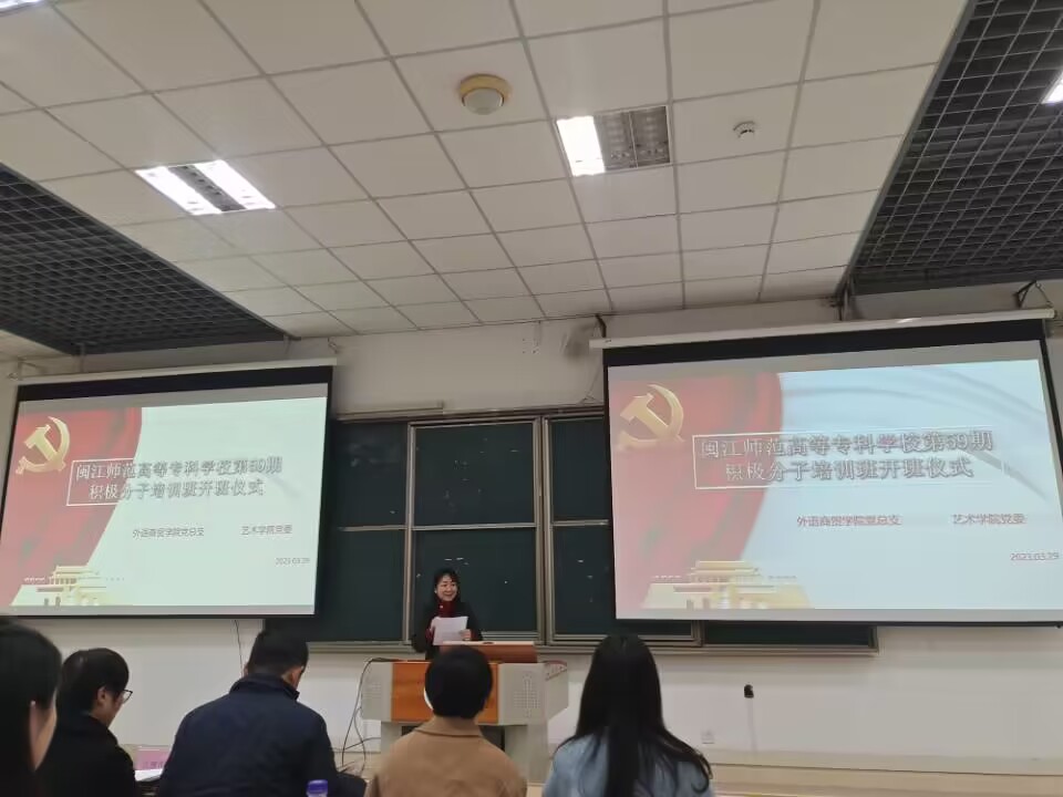根据学校党委要求和学院党总支部署安排,为了更好的贯彻落实《中国共产党章程》,进一步推进入党积极分子培训工作方针的实施,落实好党员发展培训工作,帮助入党积极分子进一步掌握党的知识,提高素质,切实保证新发展党员的质量,我院党总支于2023年3月29日在旗山校区3018教室与艺术学院党委联合举办了闽江师范高等专科学校第59期入党积极分子培训班开班仪式。外语商贸学院党总支书记林冉、艺术学院党委书记江柳青、外语商贸学院教师支部书记陈颖、外语商贸学院组织员詹秀萍、艺术学院组织员林惠楠、艺术学院学生支部组织委员沈景城以及两个学院的82名入党积极分子参加了本次开班仪式,仪式由外语商贸学院党总支纪检委员、教师支部副书记何凌主持。