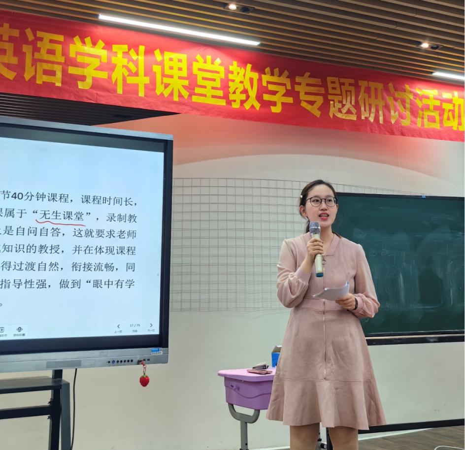 紧接着,福州教育学院附属第二小学的叶芳老师带来了《以“新”为依以“课”为论——立足新课标理念的小学英语精品课的设计与制作》的讲座。叶芳老师向大家分享自己录制精品课的心路历程,将精品课课件以及录制的要点细细讲授并分享给大家,让我们英语教育专业的提前对自己的岗位任务有了新的认知。