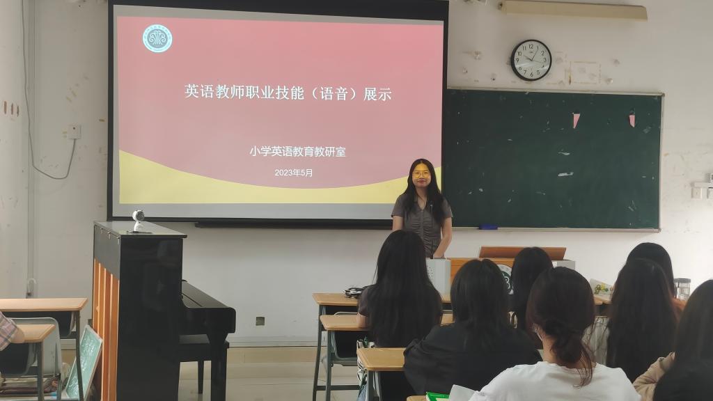 为了增强学生英语教师语音职业技能,在学生中形成浓厚的研习英语语音的氛围,2023年5月17日下午,外语商贸学院小学英语教育专业在3010教室举办了英语教师职业技能(语音)展示活动, 21、22级小学英语教育专业学生热烈响应并积极参与了本次活动。