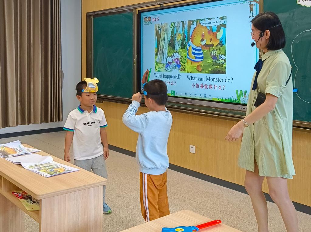 在本场活动中,台江区小学英语林玉华名师工作室成员、福州市光明小学骨干教师吴斌老师带来Icanhelp绘本教学。在教学的过程中,吴斌老师坚持以学生为中心,在做中学、学中玩。她创设情境,利用教学用具,用生动有趣的方式向学生们解读绘本,激发了学生听故事、读故事、学语言、讲故事的兴趣。在吴斌老师绘声绘色、声情并茂的引领下,孩子们沉醉其中、积极思考。