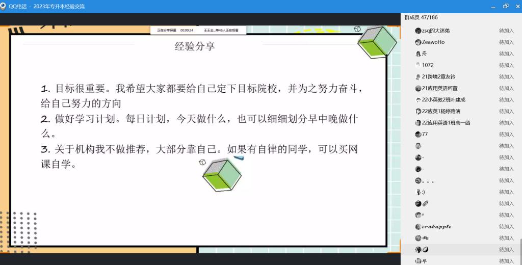 会上,詹秀萍老师介绍了过去一年我院专升本考试的概况以及四位参与分享学生的基本情况。在经验分享交流环节中,20英语教育4班的方文杉同学侧重讲解复习流程;20应用外语(柬埔寨语)的李鑫同学从“学习要有坚定的决心和毅力”、“学习需要良好的计划和组织”和“知识关联,增强记忆力”几个方面分享了学习策略;20英语教育1班杨玉萍强调要做好学习规划,做好备考科目学习时间的合理分配;压轴出场的20应用英语2班陈俊远同学是今年福建省专升本状元,他从“前期选择、中期准备、冲刺准备”三个方面讲解如何制定备考计划,并无私地分享资源的搜寻方法和自己的复习资料。最后的答疑环节中,学弟学妹和学姐学长有问有答,大家热情高涨,气氛十分活跃。