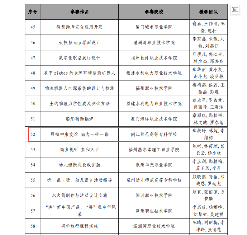 近日,2023年福建省职业院校技能大赛教学能力比赛已圆满结束,经过紧张的角逐,我院选送的团队作品《厚植中柬友谊 助力一带一路》荣获高等职业教育组三等奖,参赛团队教师为郑美玲、林超、李绍梅。