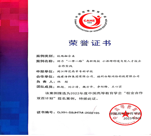 近日,中国高等教育学会公布了2022年校企合作“双百计划”典型案例名单。我院应用外语专业林超老师申报的《助力“一带一路”---小语种跨境电商人才校企合作实践》成功入选2022年产教融合校企合作典型案例。