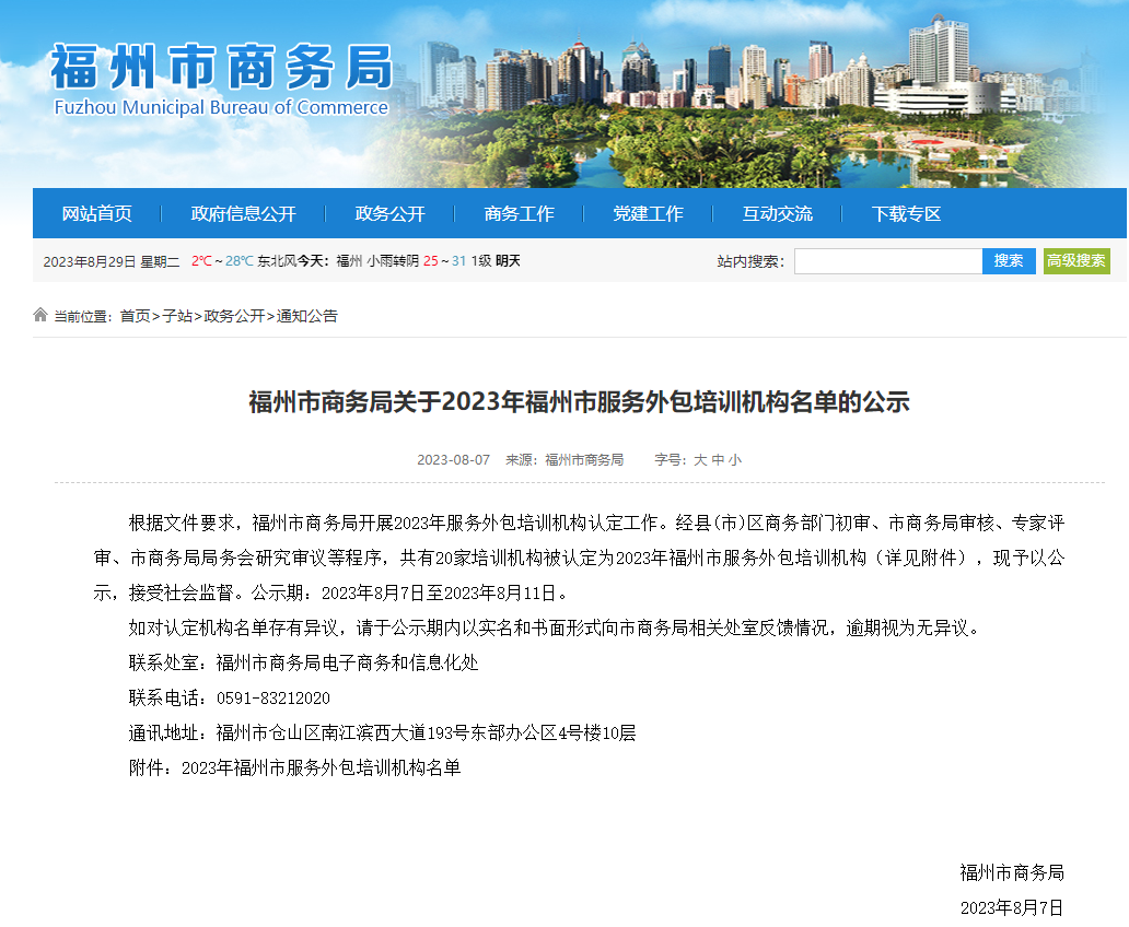 近日,福州市商务局公布了2023年福州市服务外包培训机构名单,经县(市)区、高新区商务主管部门推荐、福州市商务局组织专家评审、局务会研究审议等程序,我校成功入选,成为福州市商务局开展电子商务类技能培训的服务外包机构,将重点开展电子商务技能与跨境电子商务技能的培训。本次服务外包培训由外语商贸学院与继续教育学院联合申报,建立在我校专业建设基础扎实、培训项目承接多、经验丰富的基础之上。